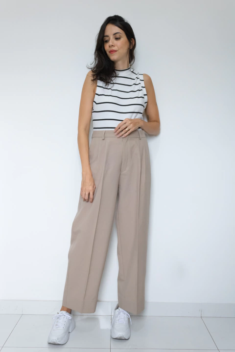 Calça em alfaiataria na cor bege. Bolsos funcionais na frente e atrás, bolso faca e passante de cinto. Com pregas na parte da frente. Fechamento por zíper e colchete.